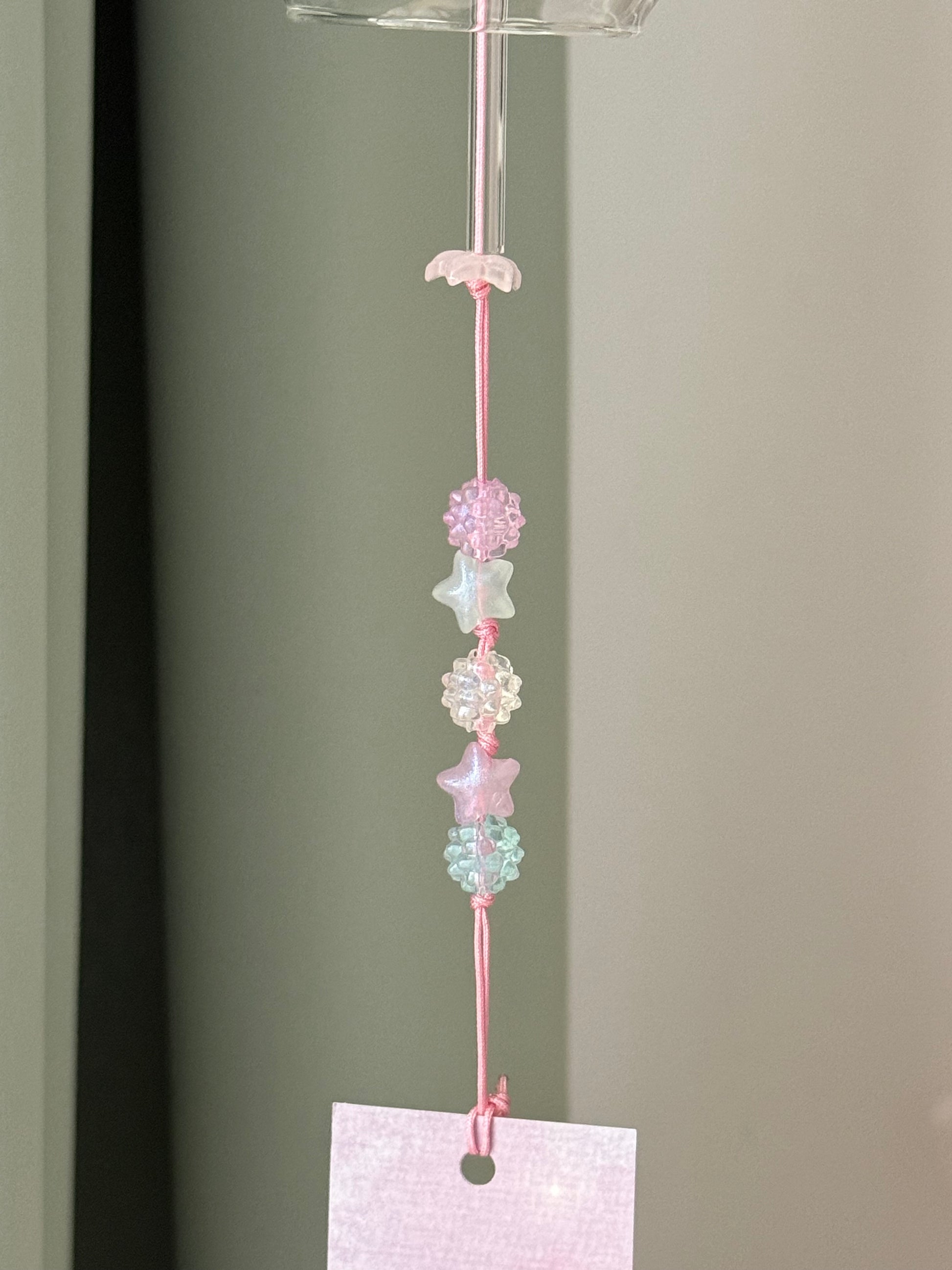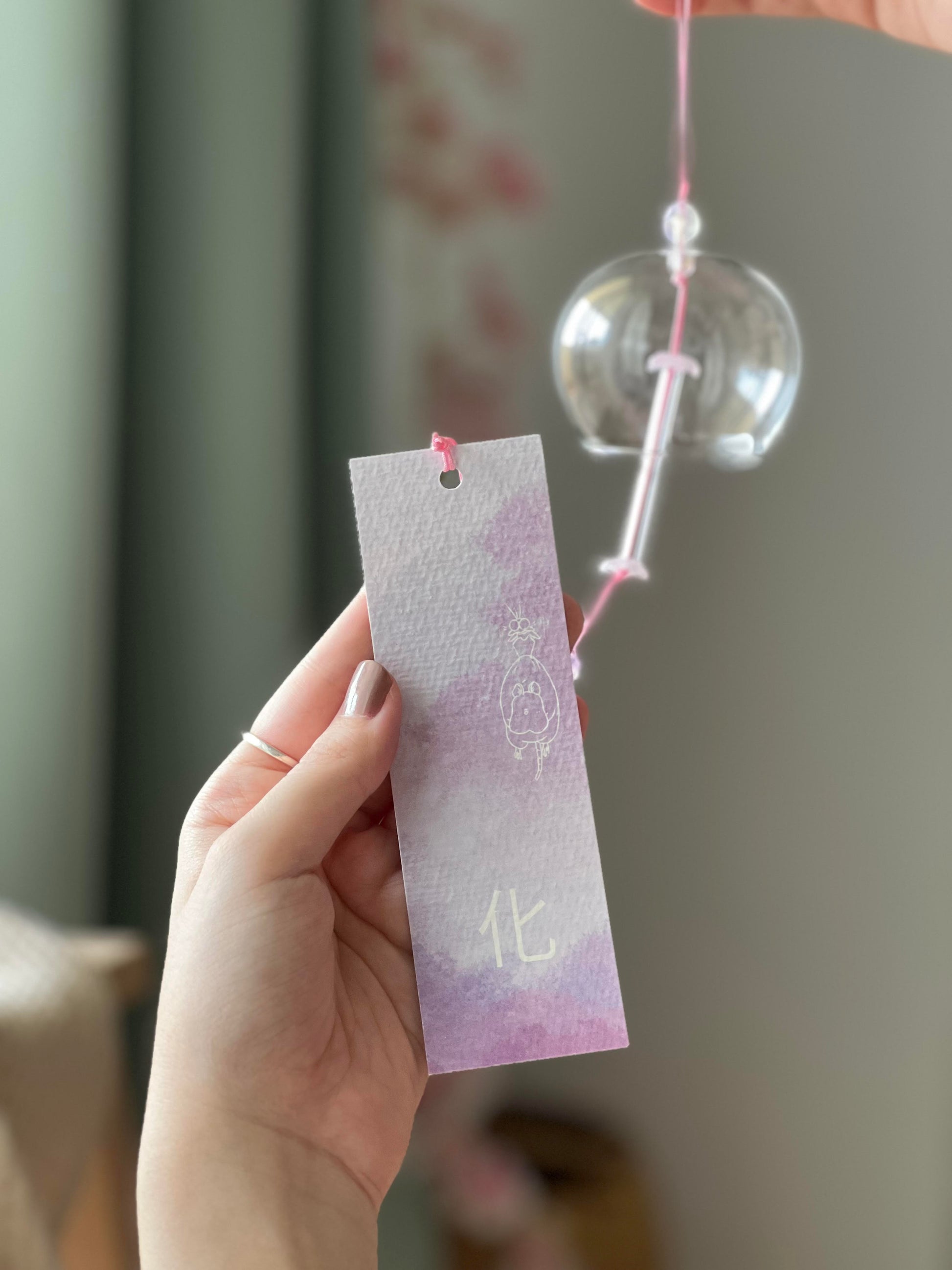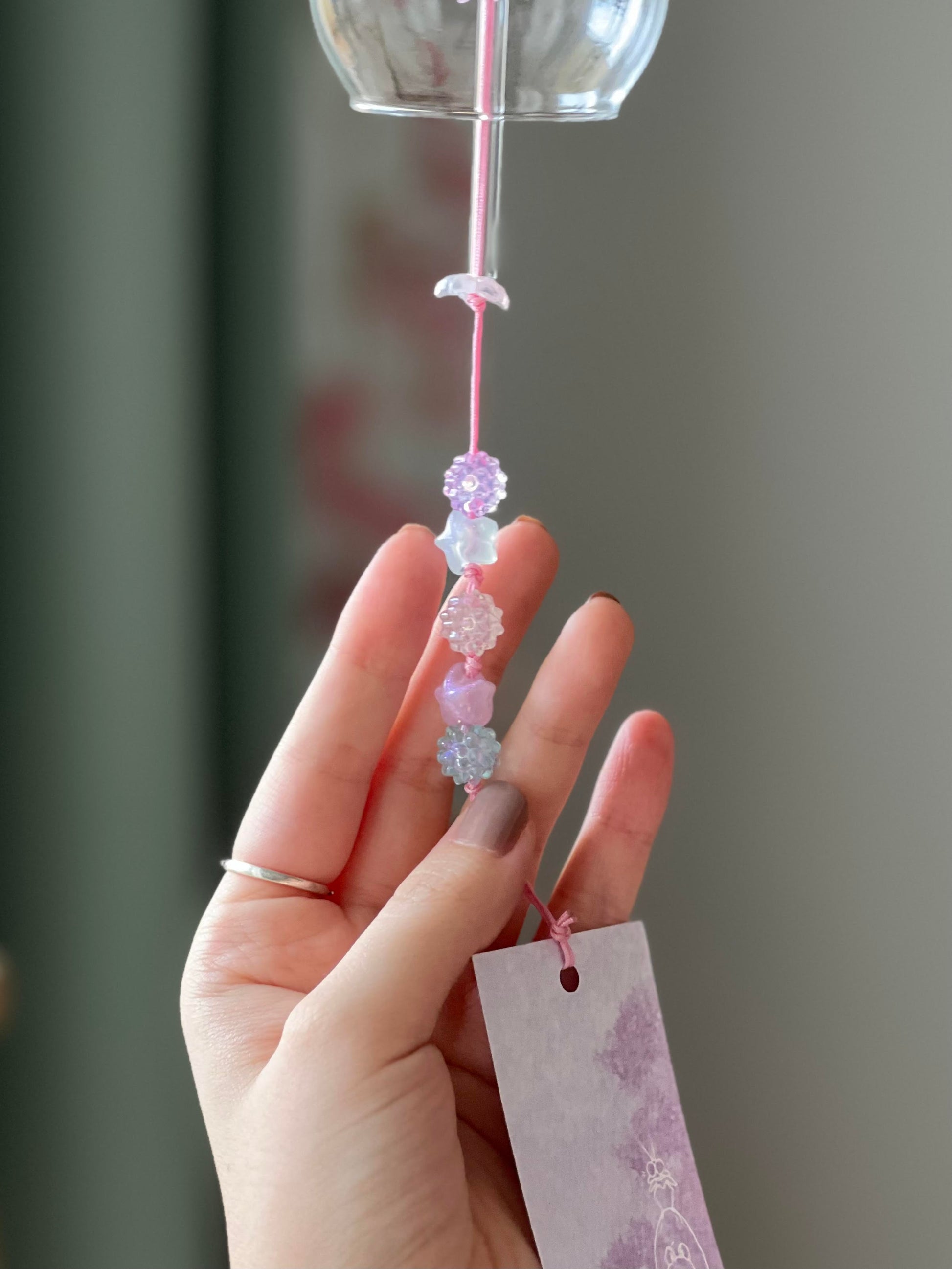 Materiales: campanilla de vidrio, cuentas acrílicas y tanzaku impreso en papel verjurado de alta calidad.