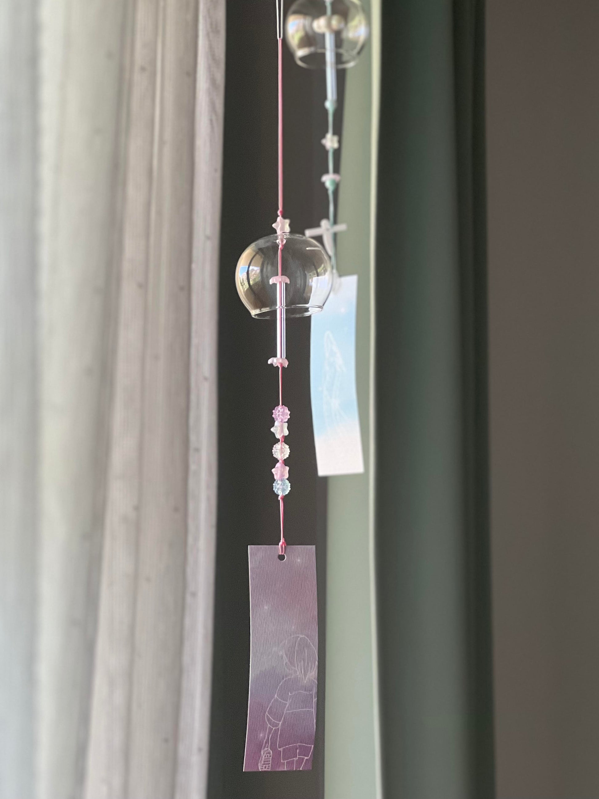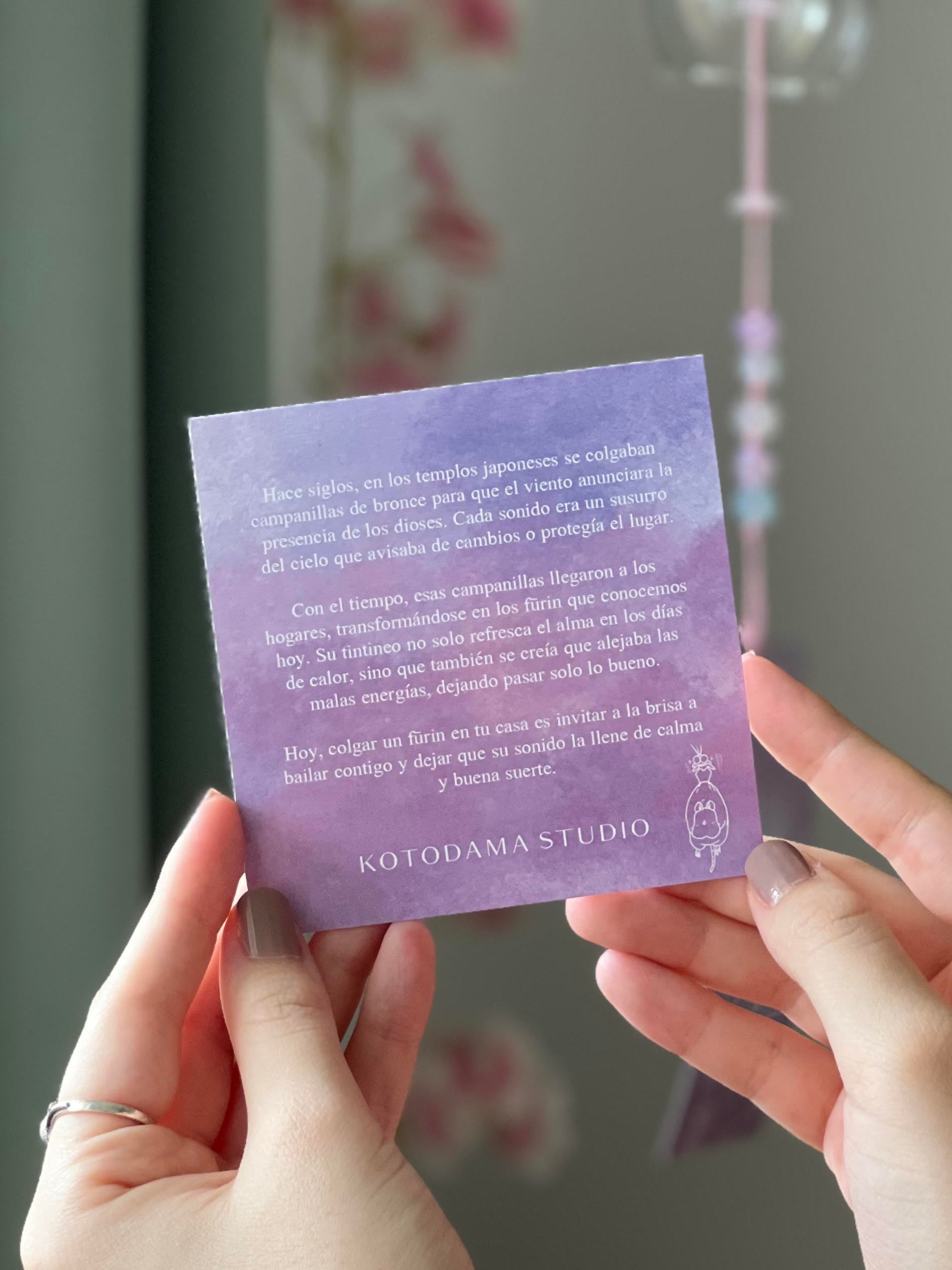 El fūrin es una campanilla de viento tradicional japonesa. Suele colgarse en ventanas, balcones o como decoración en interiores, y su sonido se asocia con la tranquilidad y los buenos deseos. Además de su sonido relajante, el fūrin es un objeto decorativo cargado de simbolismo; se cree que su sonido ahuyenta lo negativo y atrae la buena energía, convirtiéndolo en un amuleto para el hogar.