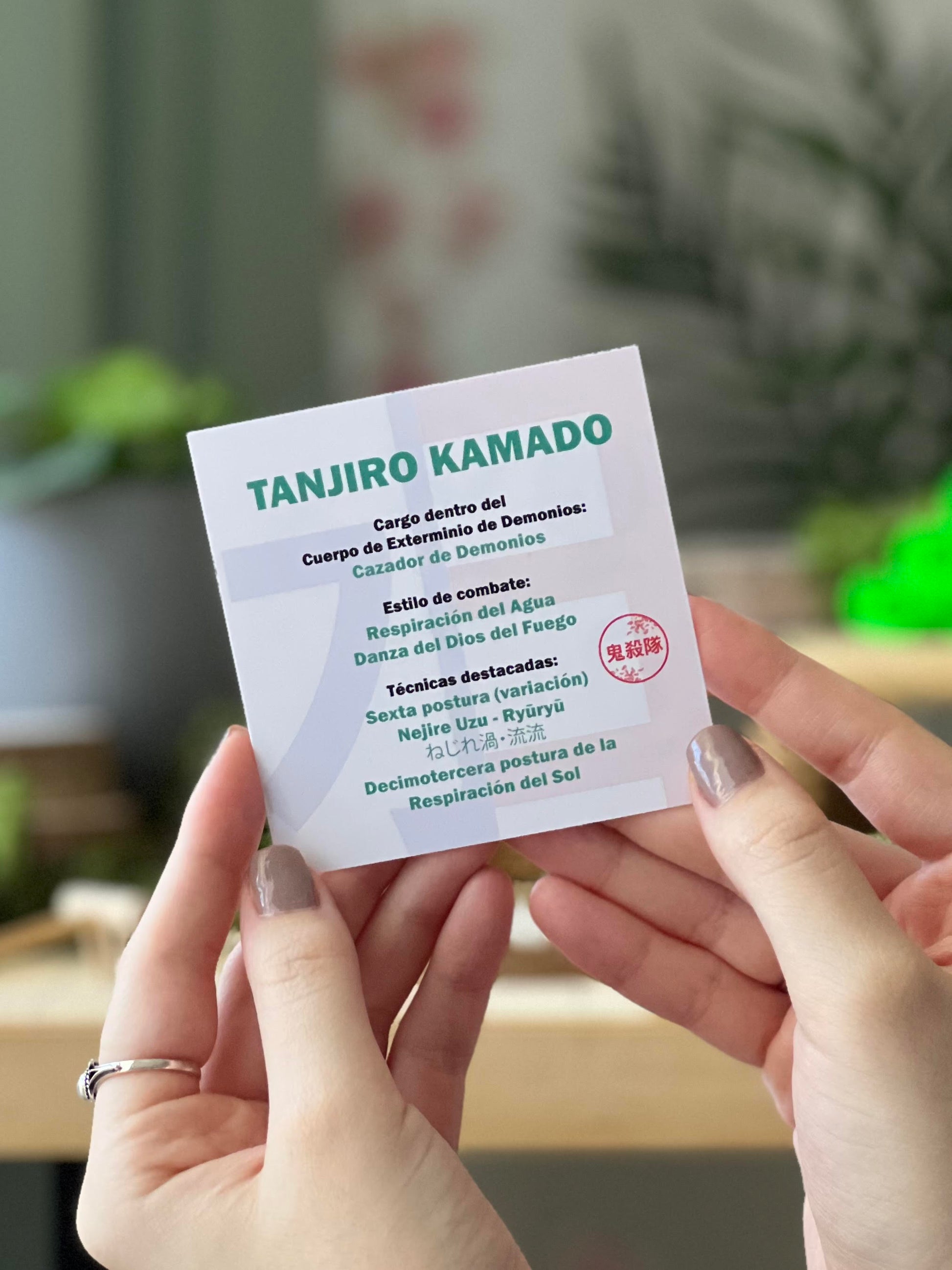 - Una tarjeta con su ficha técnica, con toda su información sobre su papel dentro del Cuerpo de Exterminio de Demonios.