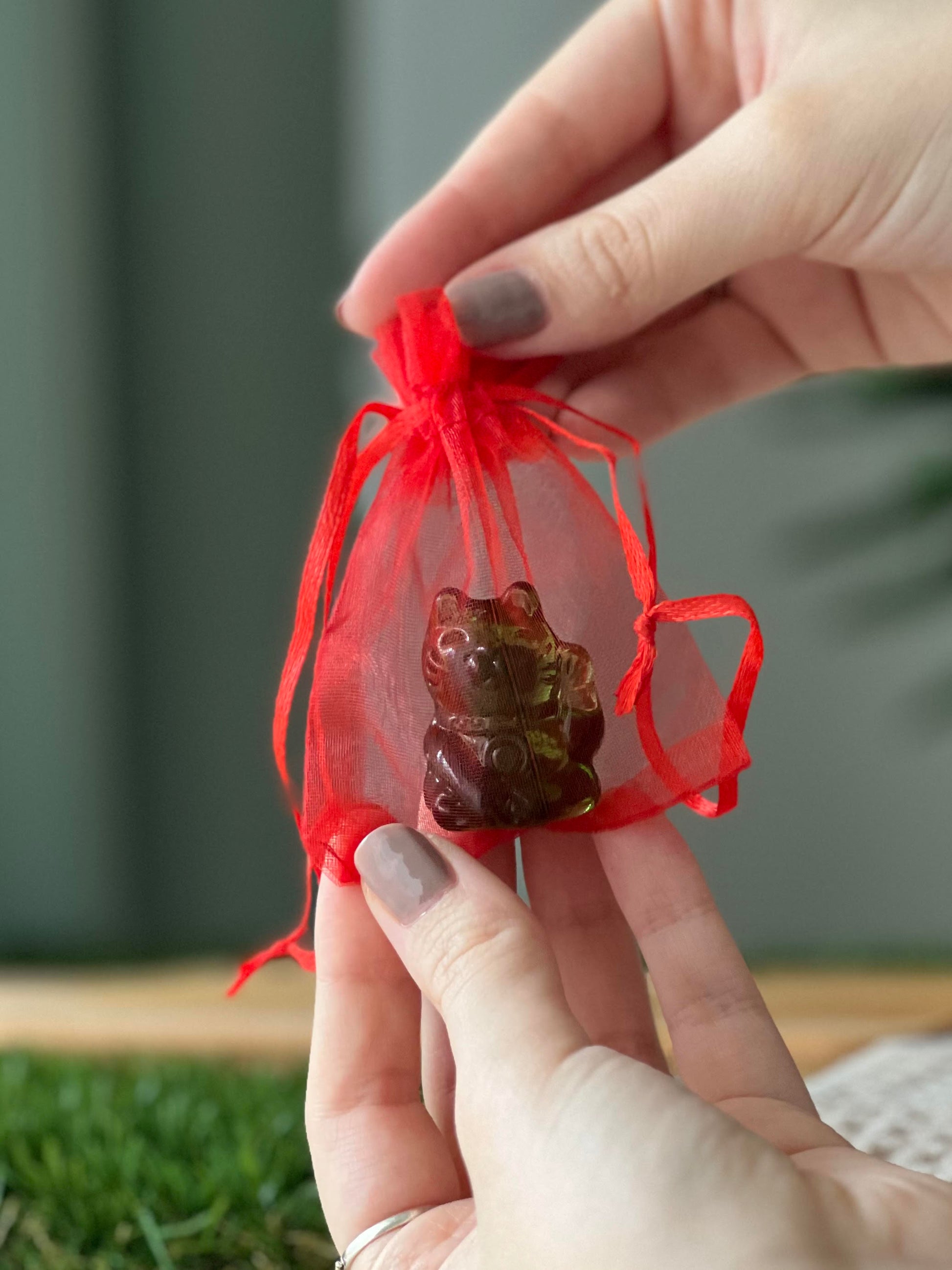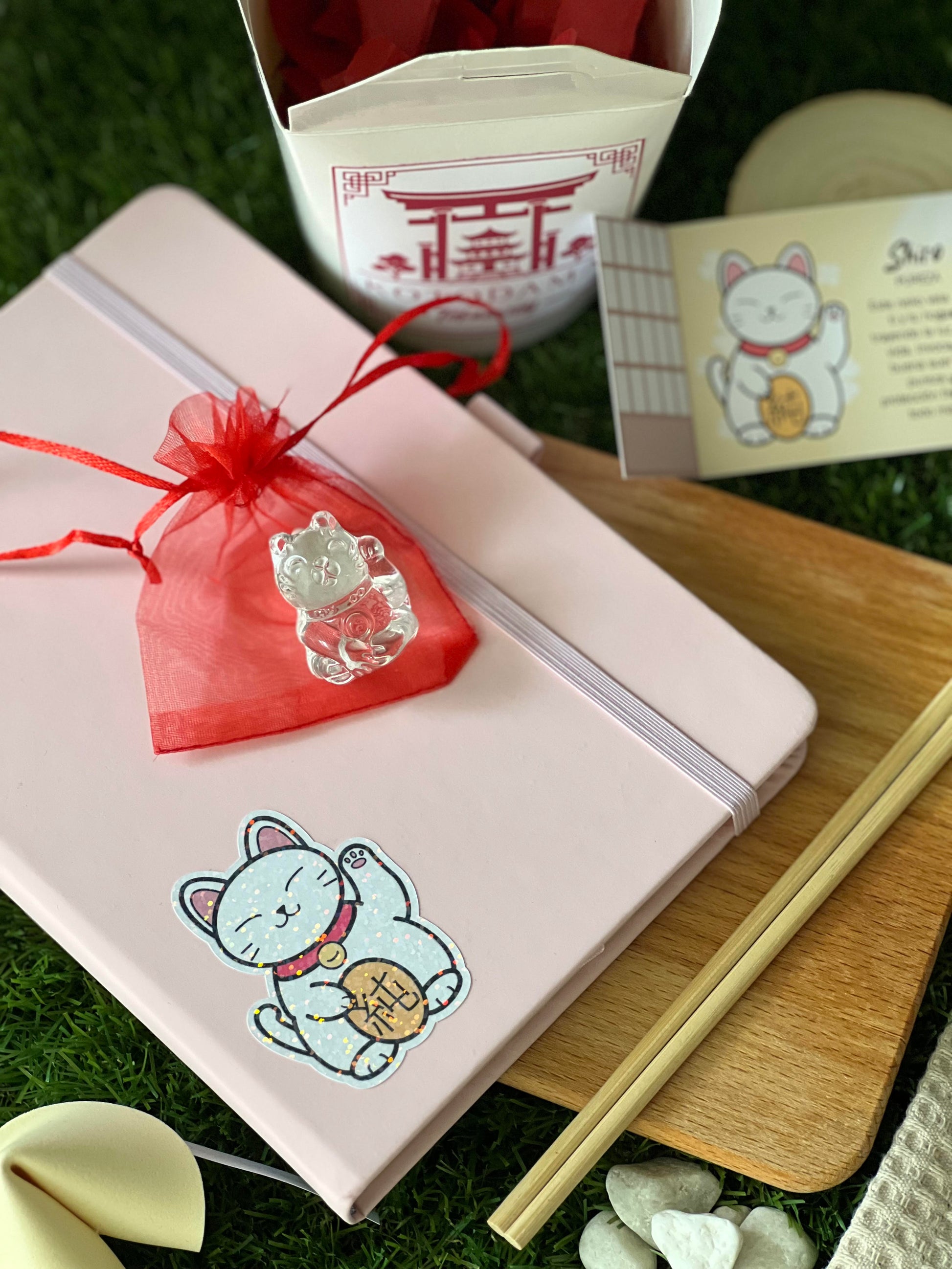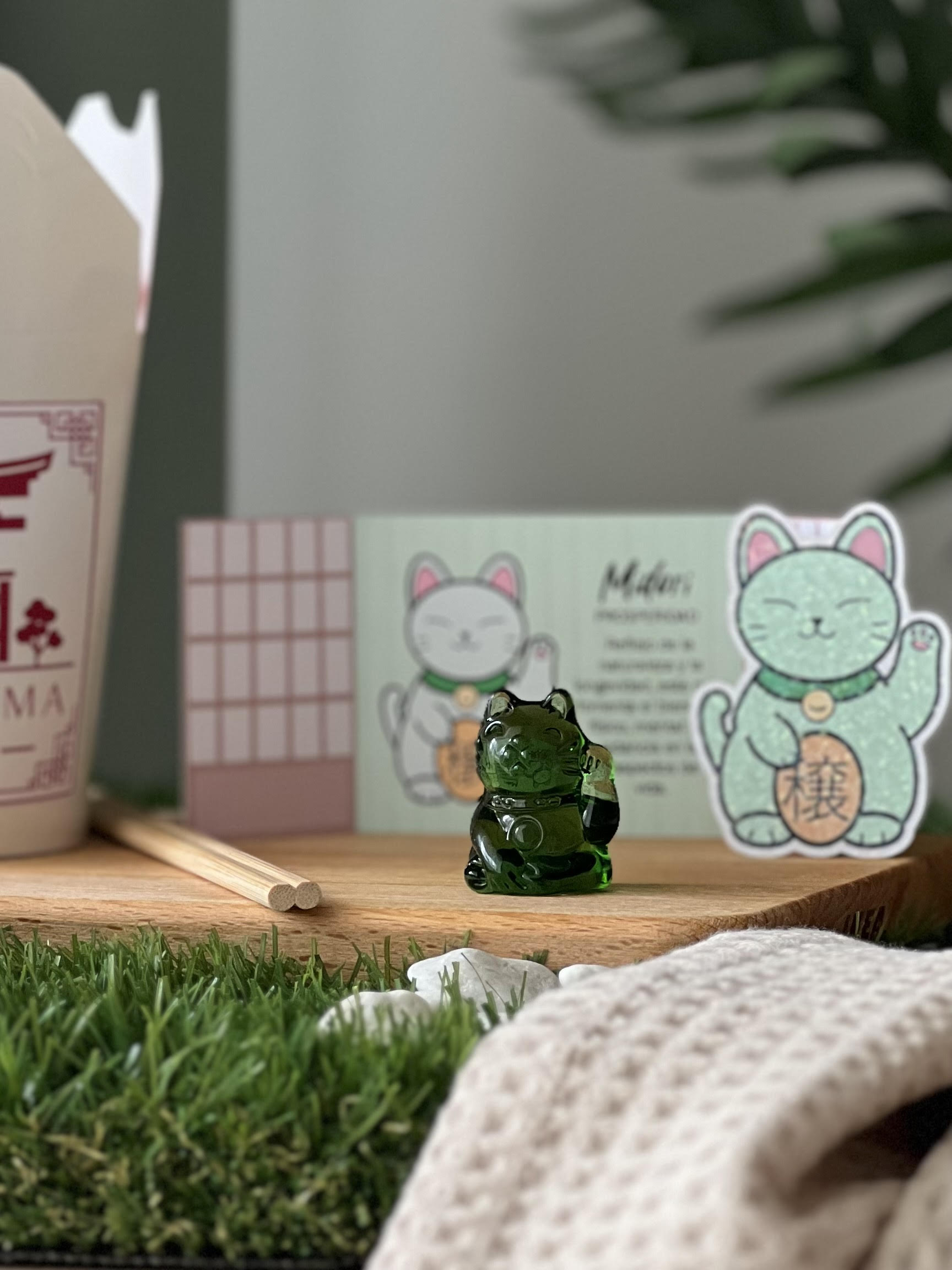 - Un neko-amuleto de cristal, en uno de los cuatro colores (rosa, blanco, negro o verde) dentro de una bolsita roja de organza para poder llevarlo contigo siempre.